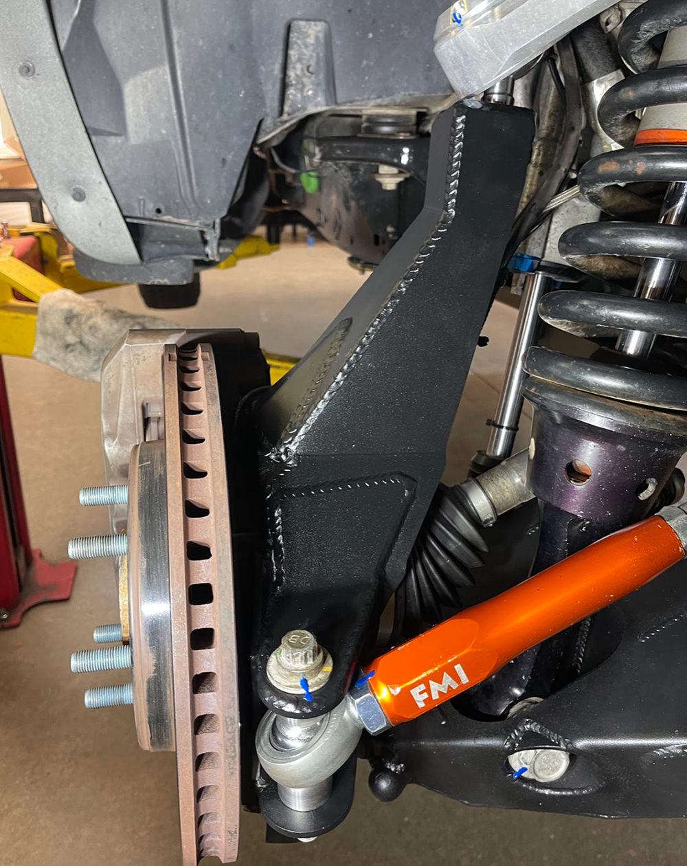We took painstaking time to make sure the upright has proper steering stops built in to ensure that your steering and CV joints are protected. The upright was designed to work with your factory stock upper and lower arms, and any combination of aftermarket upper and lower arms that would mount to a stock ball joint location. This upright will work with the factory stock Raptor wheels with no problem. The kit will work with any ½ tie rod kit or full billet tie rod kit that uses a 7/8 rod end at the wheel and is only available in Hammer black.